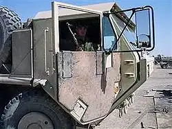 To protect themselves from these threats, American troops began reinforcing their Humvees, LMTVs and other vehicles with whatever was available, including scrap metal, kevlar blankets and vests, compromised ballistic glass and plywood. In some cases they relied on Iraqis to assist them in these efforts, and referred to the result as "hajji" armour.[11] They were also officially advised to line the floors of their Humvees with sandbags to deaden the impact of IED and land mine explosions.[12]