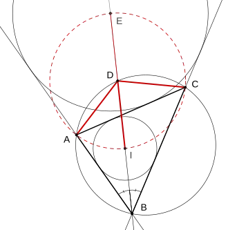 A fourth point E, the excenter of ABC relative to B, also lies at the same distance from D, diametrically opposite from I.[5][11]