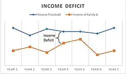 Income deficit is the difference between a single person or family's income and its poverty threshold or poverty line, when the former is exceeded by the latter.[1] Data on the income deficits of various members of a population allow for the construction of one type of measurement of income inequality in that population. Individuals or families that fall below the line are considered to be in poverty whereas families that fall above are not.[2] The income deficit is one of two measures that are used to determine a person or family's income distance from the poverty threshold, the other being a ratio rather than a difference.
