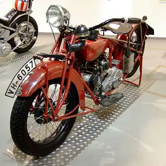 Designed by Charles B. Franklin,[1][3] the Scout was introduced in October 1919 as a 1920 model. The Scout had a sidevalve V-twin engine with its transmission bolted to the engine casing, allowing a geared primary drive - the only American v-twin to use this maintenance-free system.[4] The Scout engine initially displaced 606 cc (37 cu in), but the engine size was increased to 745 cc (45 cu in) in 1927 in response to the popularity of the Excelsior Super X.[1][5] In early 1928, a front brake was added to the Scout.[6]