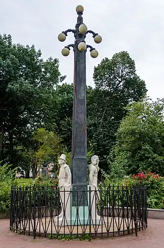 The monument is a 22-foot (6.7 m) bronze lamp standard featuring two carved marble sculptures, a Native American and a Puritan. The lamp standard has Newark's city seal and two inscriptions that describe the city's history.[3] The monument was commissioned by the city to commemorate its 250th anniversary, 1666–1916. It was moved to its current location in Washington Park in 1977.[4]