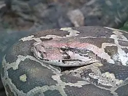 The Indian python (Python molurus) is a large python species native to tropical and subtropical regions of the Indian subcontinent and Southeast Asia.[3] It is also known by the common names black-tailed python,[4] Indian rock python, and Asian rock python.[5][6] Although smaller than its close relative the Burmese python, it is still among the largest snakes in the world. It is generally lighter colored than the Burmese python and reaches usually 3 m (9 ft 10 in).[7] Like all pythons, it is nonvenomous.