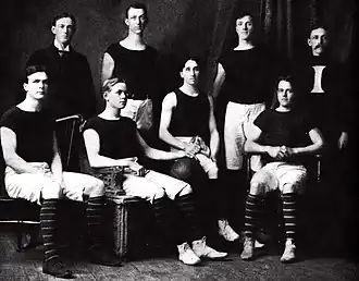McCracken's first IU team was led by All-American Ernie Andres, later a McCracken basketball assistant.[14] In McCracken's first year, the team finished 17–3, splitting games with both Purdue and eventual NCAA runner-up Ohio State.[14] The following year the 1939–40 NCAA title team, led by All-American Marvin Huffman, would take Indiana to unprecedented success: an NCAA title and a record (at the time) 20 wins.[16] The 20–3 record by that team would not be bested for another 13 years until broken again by Indiana.[16] At their home court at The Fieldhouse, Indiana saw six perfect seasons including a 24-game unbeaten home winning streak from 1938 to 1941. In 1948, McCracken was responsible for recruiting Bill Garrett who became the first African American player in Big Ten varsity basketball history.