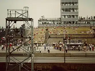 Prior to the 1970s, there were not grandstands in all four corners. Most notably the reporters in turn two and turn three did not have grandstands to serve as a vantage point until later years. Without grandstands, reporters in those turns may be stationed trackside, in the infield, or perched on a photography platform, with usually limited views.