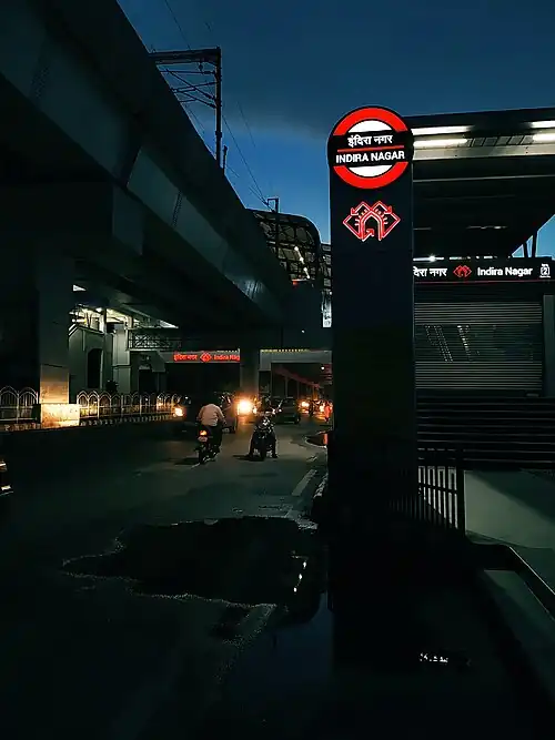 Indira Nagar is an elevated metro station on the North-South Corridor of the Red Line of Lucknow Metro in Lucknow, Uttar Pradesh, India. It was opened to the public on 8 March 2019.[1][2][3]