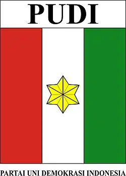 In 1995, unlike the three government-sponsored political parties (referred to as Social-Political Organization, Orsopol, by the New Order government), which each included only one or two of the Garuda Pancasila emblems and had one party color, PUDI, which took the red-white-green party colour, made the entire Garuda Pancasila emblem complete with its shield as the party emblem as in the cover of PUDI's political manifesto.[10] In his new party proclamation Sri Bintang, among other things, said that his party took the decision to conduct a political struggle by upholding the principles of democracy in an effort to carry out reforms to the state administration system into a state administration system whose people are sovereign, independent, and free from fear.[12]