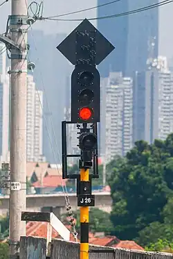 the arm on the signal face slopes downward, or yellow light on advance signal. The Semboyan 9A2 is an advance signal that indicates that the incoming signal in front of it is unsafe, the train is entering at a limited speed. |