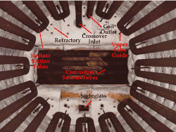 The tubes, shown below, which are reddish brown from corrosion, are carbon steel tubes and run the height of the radiant section. The tubes are a distance away from the insulation so radiation can be reflected to the back of the tubes to maintain a uniform tube wall temperature. Tube guides at the top, middle and bottom hold the tubes in place.