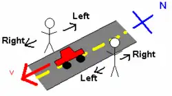 For a simple example involving only the orientation of two observers, consider two people standing, facing each other on either side of a north-south street. See Figure 2. A car drives past them heading south. For the person facing east, the car was moving to the right. However, for the person facing west, the car was moving to the left. This discrepancy is because the two people used two different frames of reference from which to investigate this system.