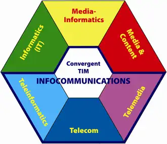 The relationship and position of the terms can be demonstrated by a digital convergence prism[1] (Figure 1), which shows the three components (T, I, M) and their pairs and the triple combination (convergent TIM triplet) according to the rule of additive colour mixing. Assuming that telecommunications (Telecom) is blue, informatics (IT) is green and Media & Content is red, then teleinformatics/telematics is cyan, telemedia/networked media is magenta, media informatics is yellow, and the convergent TIM is white. In such a way, the integrated TIM sector corresponds to the prism as a whole, the ICT sector to the whole minus the red area (Media & Content), and the Infocommunications relates to Telecom and neighbouring three areas (blue, cyan, magenta and white). That means that, for example, media informatics is a part of ICT but not part of Infocommunications.