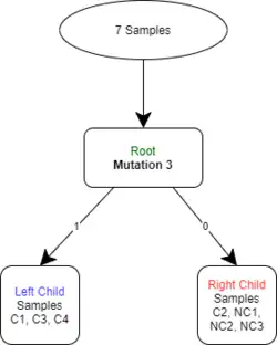 The mutation that provides the most useful information would be Mutation 3, so that will be used to split the root node of the decision tree. The root can be split and all the samples can be passed though and appended to the child nodes. A tree describing the split is shown on the left.