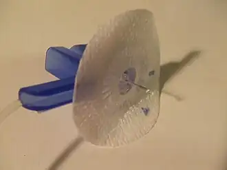 An infusion set is used with devices such as an insulin pump. The purpose of an infusion set is to deliver insulin under the skin, fulfilling a similar function like an intravenous line.[1] It is a complete tubing system to connect an insulin pump to the pump user and as such includes a subcutaneous cannula, adhesive mount, quick-disconnect, and a pump cartridge connector.