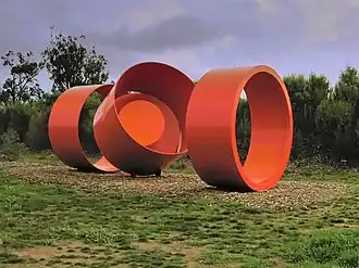 This work was installed in 1980, on a small lawn outside the Union Building at the heart of the University of Melbourne.[52] It is formed from 19mm steel, and consists of two upright steel circles, each 360 cm in diameter, and three folded metal planes; the total length is 6 metres.[53] It provides the students with a unique resting place among its massive unfurling bands and is the focal point of one of the university's busiest outdoor spaces, the Union Lawn.[54] see more images