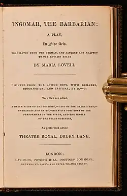 Ingomar the Barbarian is an 1851 historical play by the British writer and former actress Maria Ann Lovell. It was based on the German play Der Sohn der Wildnis by Friedrich Halm.[1] It premiered at the Theatre Royal, Drury Lane on 9 June 1851. The original cast included John Garside Neville as the Timarch of Masillia, James Robertson Anderson as Ingomar and Charlotte Vandenhoff as Parthenia. It appeared frequently on the American stage for the remainder of the nineteenth century.