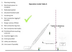Insulating links may be used on cranes and tag lines, (guide ropes), to help protect against electric current passing from the power line through the wire rope of the crane and into the personnel working on the crane, figure 4. Figure 5 shows the Federal requirements for working close to a power line. The list includes layers of prevention. Incidents of power line contact are common because of the difficulty the driver of the crane has in distinguishing the thin cable of the power line against the background of the sky. Implementing OSHA's federal requirements for operation near electric powerlines, which includes using a spotter to help the operator know if the crane's wire rope is getting close to the thin cable of the power line, provides for safe operation.