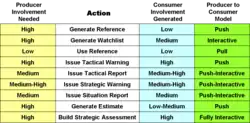 Intelligence has to be relevant. Assuming that some reference is considered to be useful, such as a basic country reference, users pull information from it when they have a question. There is relatively little interaction involved in producing the reference; analysts add to it when they have new material.
