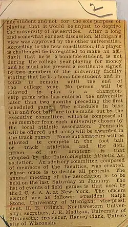 - ^ "College Athletes Organize". unknown. April 17, 1892.(newspaper clipping located in the Ralph Stone papers, Bentley Historical Library, Box 1, folder "Intercollegiate Athletic Association of the Northwest 1950-1951")