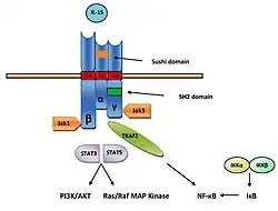 In mast cells, the IL-15R signaling pathway has been found to include Jak2 and STAT5 instead Jak1/3 and STAT3/5. Phosphorylation STATs form transcription factors and activate transcription of appropriate genes. The β chain of IL-15R recruits and also activates protein tyrosine kinases of the Src family including Lck, Fyn and Lyn kinase. It also activates phosphatidylinositol 3-kinase (PI3K) and AKT signaling pathway and induce expression of transcription factors including c-Fos, c-Jun, c-Myc and NF-κB.[15]