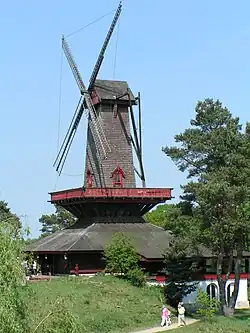 The Alphonse Daudet windmill was built in 2002 (photo: see above) as a replica. The prototype was built in 1813 in Fontvieille near Arles in French Provence. The poet, Alphonse Daudet (1840–1897), immortalised it in the 19th century in his book, Letters From my Mill. In 1935 the "Society of the Friends of Alphonse Daudet" dedicated the mill as a museum and, in 1936, it appeared on a French postage stamp. This type of mill first appeared in the 12th century and is one of the oldest in France.