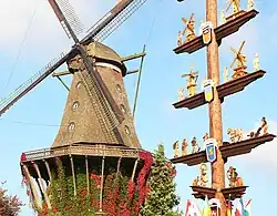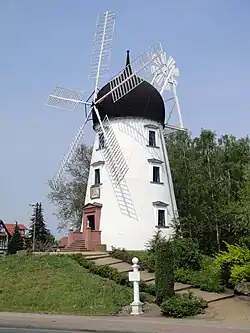 A smock mill has stood on the Dorfplatz since 1984 which is based on the historic mill near the castle of Sanssouci in Potsdam. The 40 metre high original was built in 1788, burnt down in 1945 during the final clashes of the Second World War and was rebuilt in Potsdam in 1993. The mill near the royal residence became famous through a legend that its clattering disturbed Frederick the Great. When the king threatened it with compulsory purchase, the miller was referred to the Kammergericht, or Supreme Court, in Berlin. The German name for this type of mill, Galerieholländer ("Dutch gallery mill"), refers to the circular gallery on the fourth story of the mill. The mill thus has enormous dimensions. Inside the Sansoucci mill at Gifhorn, the story of the mill museum is presented.