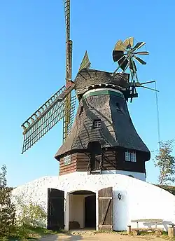 This tower mill comes from Westdorf in the district of Dithmarschen, where it was built in 1848 under the name Immanuel. It is one of the original three mills that was established at the museum. It is described in German as a Bergholländer ("Dutch hill mill") or Kellerholländer ("Dutch cellar mill"). These terms indicated that, in the former case that the mill was built on a small hill, and in the latter, that it had a cellar into which the horses and carts could be driven. During the course of its history the mill was modified many times and evolved into a highly technical mill including, inter alia an automatic wind rose. The sails could be adjusted to the wind speed. In 1969 the last miller offered to donate the mill in a newspaper advert on the condition that it was rebuilt. The newspaper publisher, Axel Springer, acquired the mill and had it restored. Later he donated it to the mill museum, where it was rebuilt in 1979.