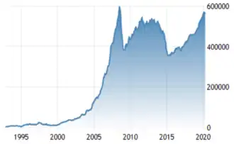 The sanctions contributed to the value's reduction of the Russian ruble and worsened the economic impact of the 2022 Russian invasion of Ukraine.[4] They also caused economic damage to the EU economy, with total losses estimated at €100 billion (as of 2015).[5] As of 2014, Russia's finance minister announced that the sanctions had cost Russia $40 billion, with another $100 billion loss in 2014 due to decrease in the price of oil the same year.[6] Following sanctions imposed in August 2018, economic losses incurred by Russia amounted to around 0.5–1.5% in foregone GDP growth.[7]