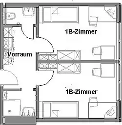 All accommodation units have a bath or shower with toilet and a kitchen. The main building also contains a number of communal areas and rooms for leisure activities. The main building is located at Rechengasse 7. The annexes are located at Rechengasse 1, Rechengasse 3 and Hormayrstrasse 12.[2]