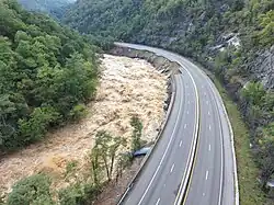 Damage from Hurricane Helene in 2024 washed away the eastbound lanes in the Pigeon River Gorge in several places resulting in a complete closure.[142] While crews worked to stabilize what was left, plans were made to put all traffic on the westbound lanes by the start of 2025, but further damage has delayed this action.[143] The road reopened March 1 with one lane in each direction and a 35 MPH speed limit.[144] The cost of rebuilding has been estimated at $750 million to $1 billion, based on the least expensive of the plans considered. Work on the permanent replacement of the eastbound lanes, including a wall along the river, is expected to start in March and take two years to complete.[145]
