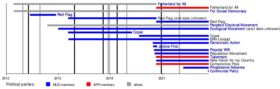 On 18 August, the TSJ additionally intervened in the far-left party Tupamaro, giving the party directive to an ad hoc board to use the seats, name, electoral card, symbols and electoral emblems of the party.[21] The intervention took place after the party announced an electoral alliance without the United Socialist Party of Venezuela (PSUV).[22] On 21 August, the TSJ did the same with the left-wing party Fatherland for All, which also announced an electoral alliance without the PSUV by dissolving the board of directors headed by Rafael Uzcátegui and replacing it with one headed by Medina.;[23][24][25][26] the high court also intervened in the Red Flag and Compromiso País parties, handing over the party to an ad hoc board.[27] On 22 August, New Vision of my Country (NUVIPA) got a new leadership appointed by the TSJ.[28]