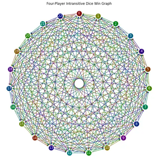 It has been proved that a four player set would require at least 19 dice.[7][9] In July 2024 GitHub user NGeorgescu published a set of 23 eleven sided dice which satisfy the constraints of the four player intransitive dice problem.[10] The set has not been published in an academic journal or been peer-reviewed.