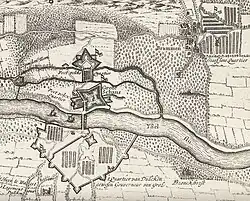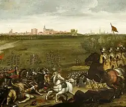 The Count of Salazar arrived before Hattem in August and demanded the surrender of the city. The situation in the city was quite chaotic. The inhabitants did not believe that the city of Hattem could put up a proper fight against the Imperial-Spanish forces due to the city being undermanned and the poor state of defences.[6] The city of Hattem did receive help from Zwolle with a company of around 300 men and 140 musketeers and food supplies. Meanwhile the city of Hattme took measures to defend the city, the city was cleaned up, and the men of the city planted green around the city walls for extra defence in order to prevent a possible storming of the city.[7] Although the city was better prepared than before, the city endured no major attack or storming, although the field deputies in Arnhem wrote that the city endured and repelled 3 major assaults.[8] The Imperial-Spanish attack on Hattem failed, and the armies matched towards Oldebroek to plunder the city and threaten Elburg in the process.[9]