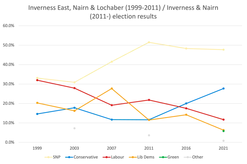 The Inverness and Nairn constituency is part of the Highlands and Islands electoral region; the other seven constituencies are Argyll and Bute, Caithness, Sutherland and Ross, Moray, Na h-Eileanan an Iar, Orkney, Shetland and Skye, Lochaber and Badenoch.