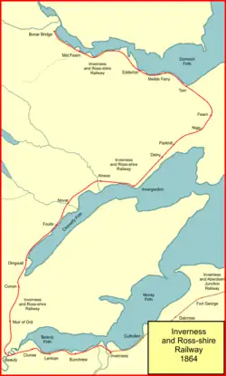 The Inverness and Ross-shire Railway was a Scottish railway company formed in 1860 to build a line from Inverness to Invergordon. It opened in 1862 as far as Dingwall and in 1863 to Invergordon. It was extended to a Bonar Bridge station in 1864. It provided the basis for later extensions that eventually reached Thurso, forming the Far North Line. The Dingwall and Skye Railway branched off at Dingwall to reach the Kyle of Lochalsh.
