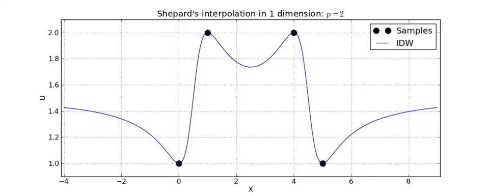 which diverges for and . For M dimensions, the same argument holds for . For the choice of value for p, one can consider the degree of smoothing desired in the interpolation, the density and distribution of samples being interpolated, and the maximum distance over which an individual sample is allowed to influence the surrounding ones.
