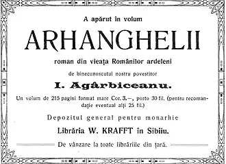 By the time World War I broke out, Agârbiceanu had three sons and a daughter,[22] including Ion Jr, the future physicist.[47] During 1914, the first year of war, he finally published Arhanghelii, as well as the stories in De la sate ("From the Villages").[48] These were followed, in 1916, by a work of Christian theology, Din viața preoțească ("From Priestly Life").[48][49] In September 1916, during the Battle of Transylvania, his Orlat house was shelled by the German Army;[39] Agârbiceanu fled Austria-Hungary with his family, following the Romanian Army on its hasty retreat. Their first destination was Râmnicu Vâlcea in the Old Kingdom; they then headed for Roman in Western Moldavia.[3][22][49] Similarly exiled and sheltered, Goga put out the propaganda paper Gazeta Ostașilor, with contributions from both Agârbiceanu and Iorga; after a hiatus caused by the fall of Bucharest in December, it was reissued as România in February 1917.[50]