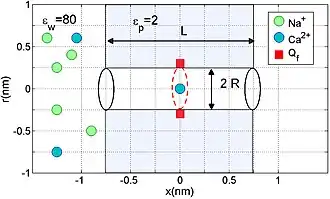 ICB effects may be derived on the basis of a simplified electrostatics/Brownian dynamics model of a nanopore or of the selectivity filter of an ion channel.[8] The model represents the channel/pore as a charged hole through a water-filled protein hub embedded in the membrane. Its fixed charge is considered as a uniform, centrally placed, rigid ring (Fig.1). The channel is assumed to have geometrical parameters length nm and radius nm, allowing for the single-file movement of partially hydrated ions.