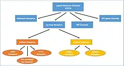 Earlier a third type of GABA receptor was discovered and named GABAC, but recently it has been categorized as a sub-type of the GABAA receptor.[3] Thus, the ionotropic GABA receptors consist of the GABAA receptor and the GABAA-ρ receptor. There are pharmacological implications in understanding the molecular structure and function of these ionotropic receptors. Since they are targeted by neuroactive drugs, this characteristic is exploited in order to deduce their molecular structure and function in the CNS.[4] For example, GABAA receptors respond to neuroactive drugs like benzodiazepines.[5] Normally increasing a neuron's permeability to chloride ions results in inhibition; bensodiazepines further propagate this event ensuring inhibition, serving as an indirect[5] factor. Armed with the knowledge of chloride ion permeability leading to inhibition, it is important to note that ethanol and barbiturates[5] can directly increase the influx of chloride ions resulting in inhibition. Further characterization of the allosteric modulations[2] of the active sites in the ionotropic gives insight on new treatments and nervous system disorders, such as panic disorder.[6]