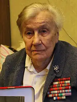 Irina Vyacheslavovna Rakobolskaya (Russian: Ири́на Вячесла́вовна Ракобо́льская; 22 December 1919 – 22 September 2016) was a mathematician and physicist who served as the chief of staff of the women's 46th Taman Guards Night Bomber Aviation Regiment during World War II. After the war she worked as a physicist at Moscow State University and studied cosmic rays. She received numerous high state awards in her career and was awarded the title Honored Scientist of the Russian SFSR in 1990. She co-authored a book with Natalya Meklin-Kravtsova, an aviator from the regiment, titled We Were Called Night Witches about their experiences in the war, as their nickname given by their German opponents, Nachthexen, meant "night witches".[1]