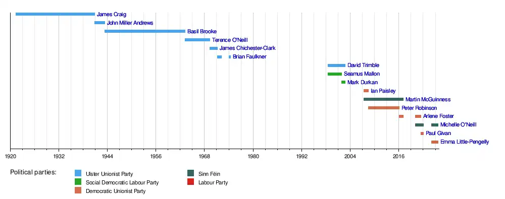 1 July 1998 | 14 October 2002 | 4 years, 105 days | Ulster Unionist Party | 1998 | First Executive |