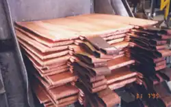 The Isa Process technology used the waxed edge at the bottom of the cathode plate to stop the copper depositing around the plate’s bottom to form a single mass of copper running from the top of one side of the cathode plate around the bottom to the top of the other side.[15] The copper was stripped from the cathode plates as two separate sheets.[15] The Kidd Process technology did not use wax, as it was thought that it could exacerbate the impurity problems with which the plant had been struggling. At Kidd, the stripping approach was to remove the copper from the cathode plate as a single V-shaped cathode product, akin to a taco shell.[15]