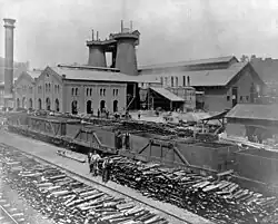 The furnaces were built by Pittsburgh-area manufacturers (Lewis Dalzell & Co; J. Painter & Sons; Graff, Bennet & Co; Spang, Chalfant & Co; Henry Oliver of Oliver Brothers & Phillips; William Smith) who were dependent on pig iron.[2] They incorporated as the Isabella Furnace Company and built two furnaces, later adding a third.[3] The first two furnaces were 75 feet high, one with a capacity of 12,800 cubic feet and the other 14,000 cubic feet. They were built following the designs of modern English furnaces, among the first in the United States and among the largest at the time.[2]