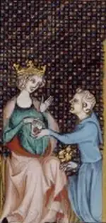 At the All Saints Parlement in 1254, Theobald of Navarre requested Isabella's hand in marriage.[2] In an attempt to resolve the inheritance of Navarre, Louis declined Theobald's request until he reconciled with his sister, Blanche of Brittany.[2] Upon the reconciliation, Louis agreed to Isabella marrying Theobald.[2] The Archbishop of Rouen celebrated the marriage between Isabella and Theobald II, King of Navarre and Count of Champagne, on 6 April 1255 in Melun.[3] Isabelle became Queen consort of Navarre.