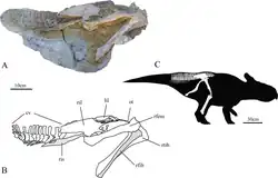 - ^ a b c d e Yiming He; Peter J. Makovicky; Kebai Wang; Shuqing Chen; Corwin Sullivan; Fenglu Han; Xing XuMichael J. Ryan; David C. Evans; Philip J. Currie; Caleb M. Brown; Don Brinkman (2015). "A New Leptoceratopsid (Ornithischia, Ceratopsia) with a Unique Ischium from the Upper Cretaceous of Shandong Province, China". PLOS ONE. 10 (12): e0144148. Bibcode:2015PLoSO..1044148H. doi:10.1371/journal.pone.0144148. PMC 4689537. PMID 26701114.