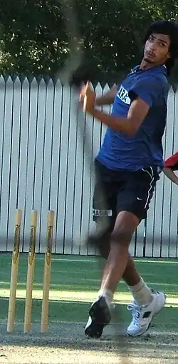 A right arm fast-medium bowler, the speed of Sharma's bowling has diminished since he emerged on the international scene,[58] although in 2008 he bowled a delivery at over 152 kilometres per hour (94 mph).[59] Such occurrences were not the norm as his pace dropped to around 130 km/h (81 mph), but under Eric Simons (who was India's bowling coach from 2010 to 2012) Sharma was regularly bowling in excess of 140 km/h (87 mph) when India toured Australia in 2011/12.[60][61] According to India's former bowling coach Venkatesh Prasad he is amongst the most dedicated bowler in India's set up.[62]