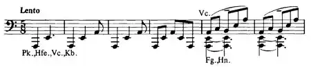 It is scored for 3 flutes (3rd doubling piccolo), 2 oboes, English horn, 2 clarinets, bass clarinet, 2 bassoons, contrabassoon, 6 horns, 3 trumpets, 3 trombones, tuba, timpani, cymbals, bass drum, harp, and strings.