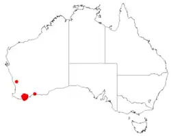 This isopogon grows in heath or shrubland in the Stirling Range and near Mount Barker in the south-west of Western Australia.[2][3]
