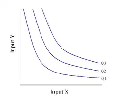 An isoquant (derived from quantity and the Greek word isos, ίσος, meaning "equal"), in microeconomics, is a contour line drawn through the set of points at which the same quantity of output is produced while changing the quantities of two or more inputs.[1][2] The x and y axis on an isoquant represent two relevant inputs, which are usually a factor of production such as labour, capital, land, or organisation. An isoquant may also be known as an "iso-product curve", or an "equal product curve".