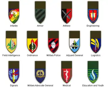 Typically, each IDF unit (yehida) has its own shoulder tag (tagei katef).[8] Shoulder tags consist of a long section and a tip, which can be one of four shapes: a circle (commands, directorates and air force units except anti-aircraft), a rectangle (Golani Brigade), a diamond, or a shield-like shape (most common). Shoulder tags are only worn on dress uniforms, on the left shoulder attached to the shoulder strap.