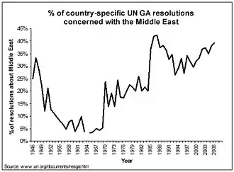In recent years, the Middle East was the subject of 76% of country-specific General Assembly resolutions, 100% of the Human Rights Council resolutions, 100% of the Commission on the Status of Women resolutions, 50% of reports from the World Food Programme, 6% of United Nations Security Council resolutions and 6 of the 10 Emergency sessions.[91]