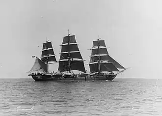 The ship embarked on a circumnavigation of the globe in 1881, which was used to gather navigation data as well as samples of marine animals. She sailed south through the Atlantic to South America; she conducted extensive hydrographic surveys along the coast of Patagonia and the Strait of Magellan. During the tour of South American waters, she visited Valparaiso, Chile.[5] By 1883, she had reached Australia; in December, she rendezvoused in Singapore with the screw corvette Cristoforo Colombo, which had been sent to protect Italian nationals in China. The two ships then sailed north to China, where they patrolled the area to protect Italian nationals in the event of a conflict.[6] By July, Caracciolo had departed, though the corvette Vettor Pisani had been sent to take her place.[7] She returned to Australian waters, cruising there through 1884, during which time she visited Sydney and Melbourne.[8] Caracciolo completed her journey later that year. During the lengthy voyage abroad, seventeen men from her crew deserted, though more than eighty men who had begun the cruise illiterate had learned to read and write.[9]